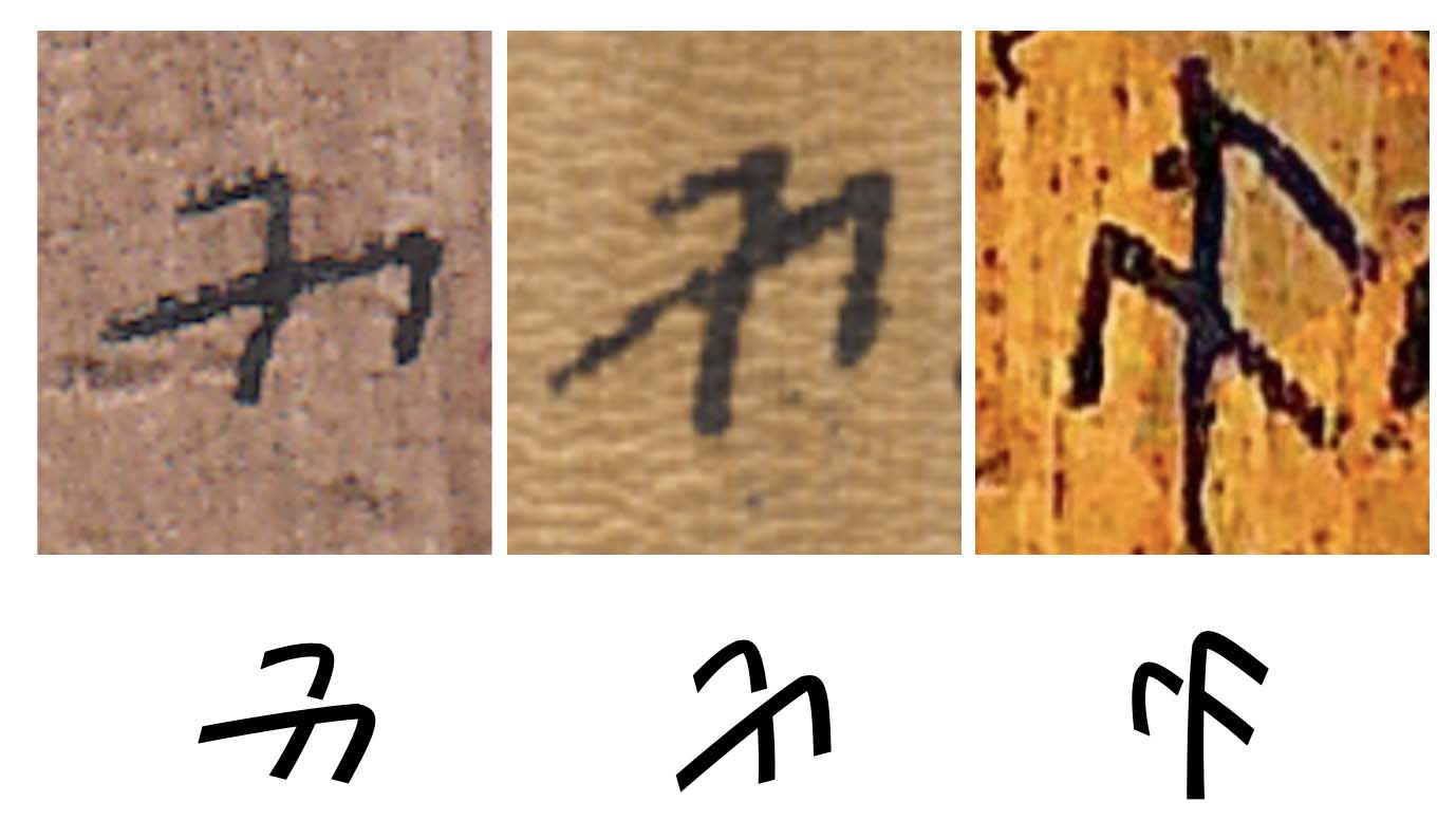 Syauqi & Sarwonoasss describe how, whereas the the main strokes of Rejang graphemes typically slant to the right, the angle can vary from upright to horizontal at the extremes, and this affects the placement of diacritics associated with a base character.